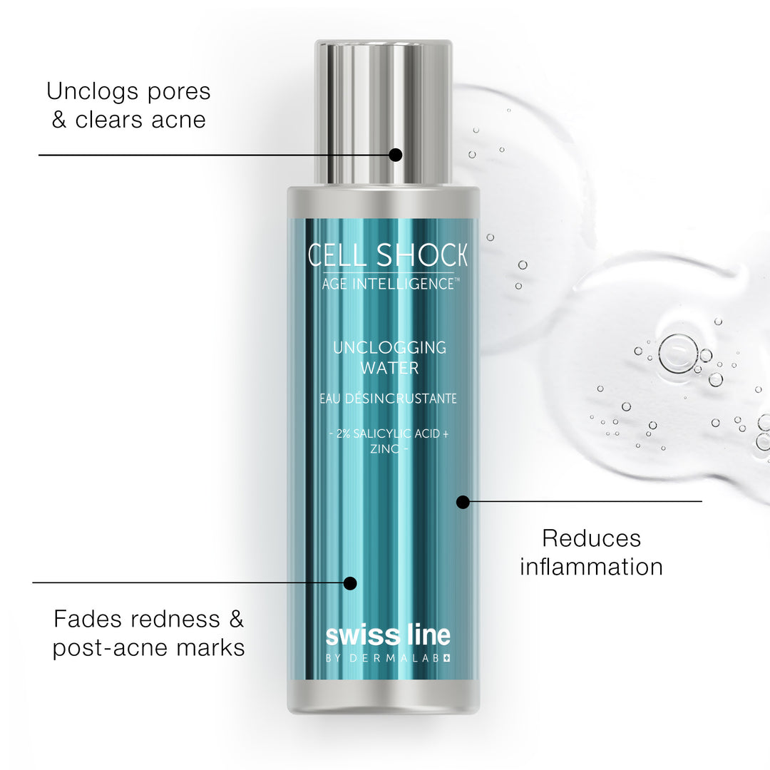 Gentle exfoliant with salicylic acid for acne-prone skin. Combat breakouts and reveal clearer skin with Unclogging Water, a clarifying toner formulated to address the root causes of acne: clogged pores, excess oil, and breakout-causing bacteria. This gentle exfoliant with 2% salicylic acid, niacinamide, and zinc sulfate works to visibly reduce blemishes, refine skin texture, and fade post-acne marks — without irritation or dryness.